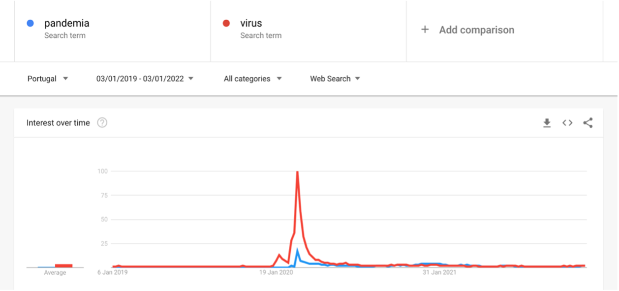 Outra questão de natureza pragmática diz respeito ao conhecimento do mundo que os falantes possuem. Até março de 2020, a palavra pandemia teria muito provavelmente uma frequência de uso muito baixa e nenhum traço particular associado. A partir dessa data, pandemia adquiriu um estatuto particular, com uma frequência de uso significativamente maior, e a capacidade de evocação imediata da pandemia desencadeada pela presença do vírus corona, na versão de 2019. A pesquisa no Google Trends[4] (cf. Figura 1) mostra bem o pico que, entre o início de 2019 e o início de 2022, as duas palavras (pandemia e vírus) registaram, no início de 2020.