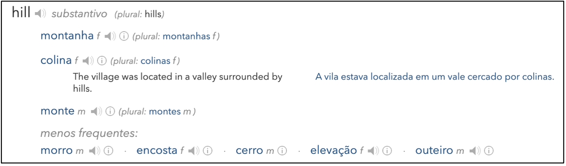 Há, portanto, discrepâncias entre os dois dicionários considerados, mas a razão para considerar o Linguee relaciona-se com a disponibilização de traduções alinhadas. No caso de hill, verifica-se que os exemplos de uso se afastam um pouco do que o próprio dicionário contempla: a tradução mais frequente converte hill em colina e colina em hill[13]; segue-se monte[14]; depois morro[15]; e, por último, montanha[16], embora, neste caso, não haja exemplos de tradução de montanha para hill. A tradução de hill como cerro, elevação, encosta, ladeira ou outeiro não encontra qualquer exemplo.