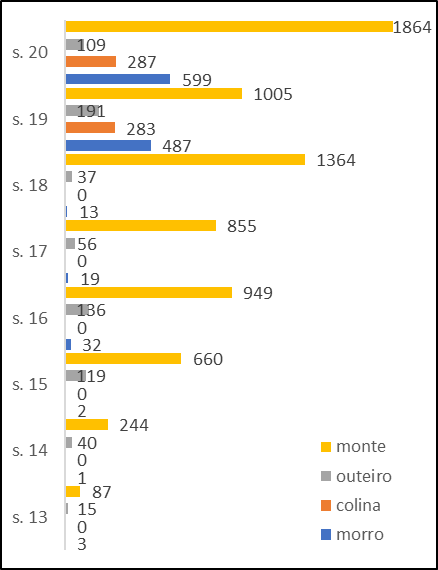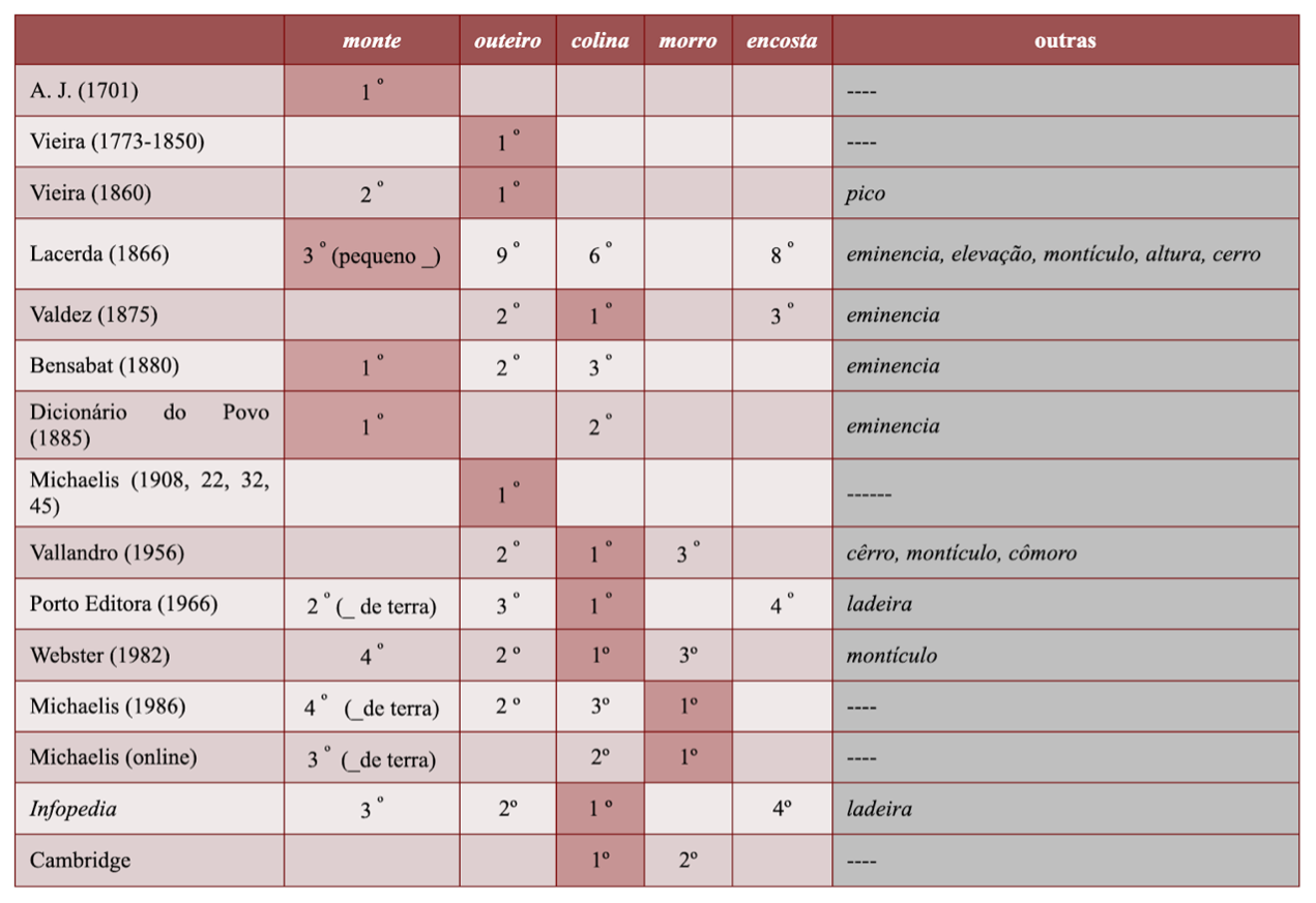 A Tabela 5 mostra os dados do uso das quatro palavras consideradas que estão disponíveis no Corpus do Português. Essa tabela torna claro que monte é uma das formas mais antigas e a mais frequente, de forma constante, até ao presente; mostra que outeiro é uma palavra antiga e crescentemente em desuso (sendo apenas preservada na toponímia); e mostra ainda que a introdução de colina e de morro, palavras muito mais recentes, ocorre em simultâneo e em distribuição complementar no português europeu e no português brasileiro.