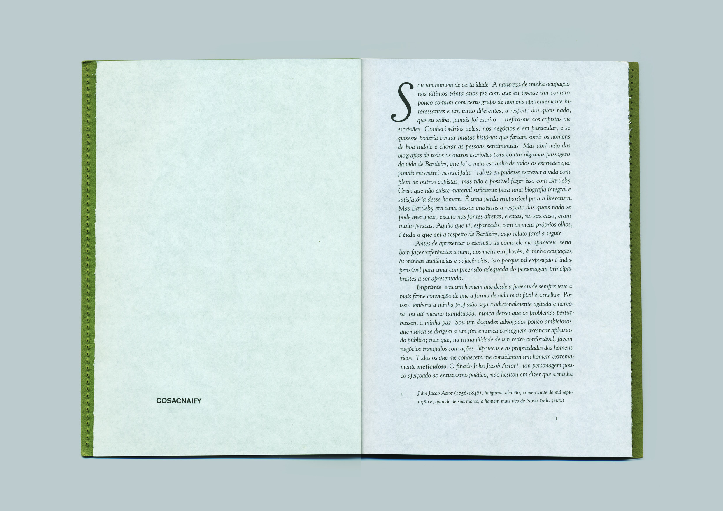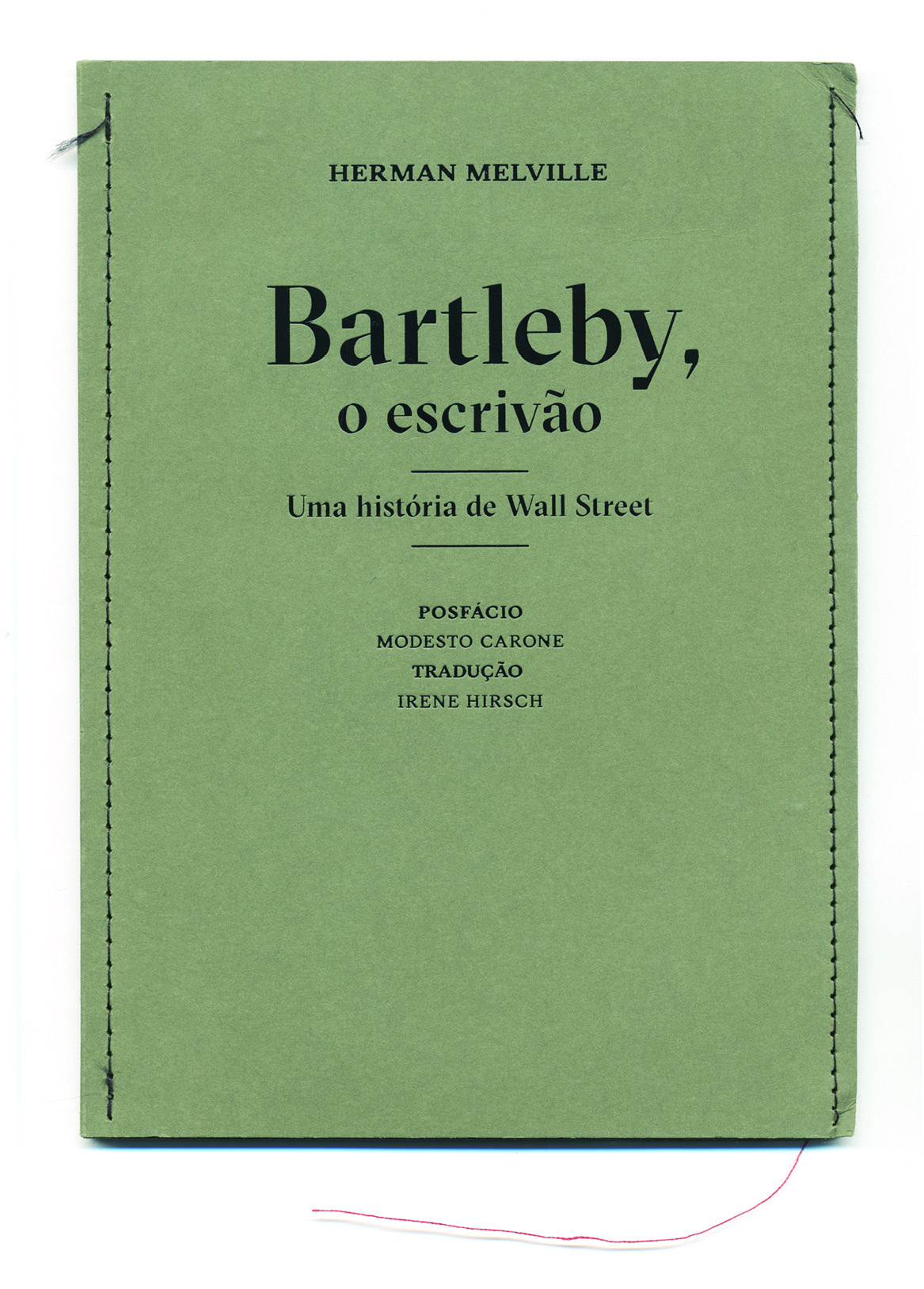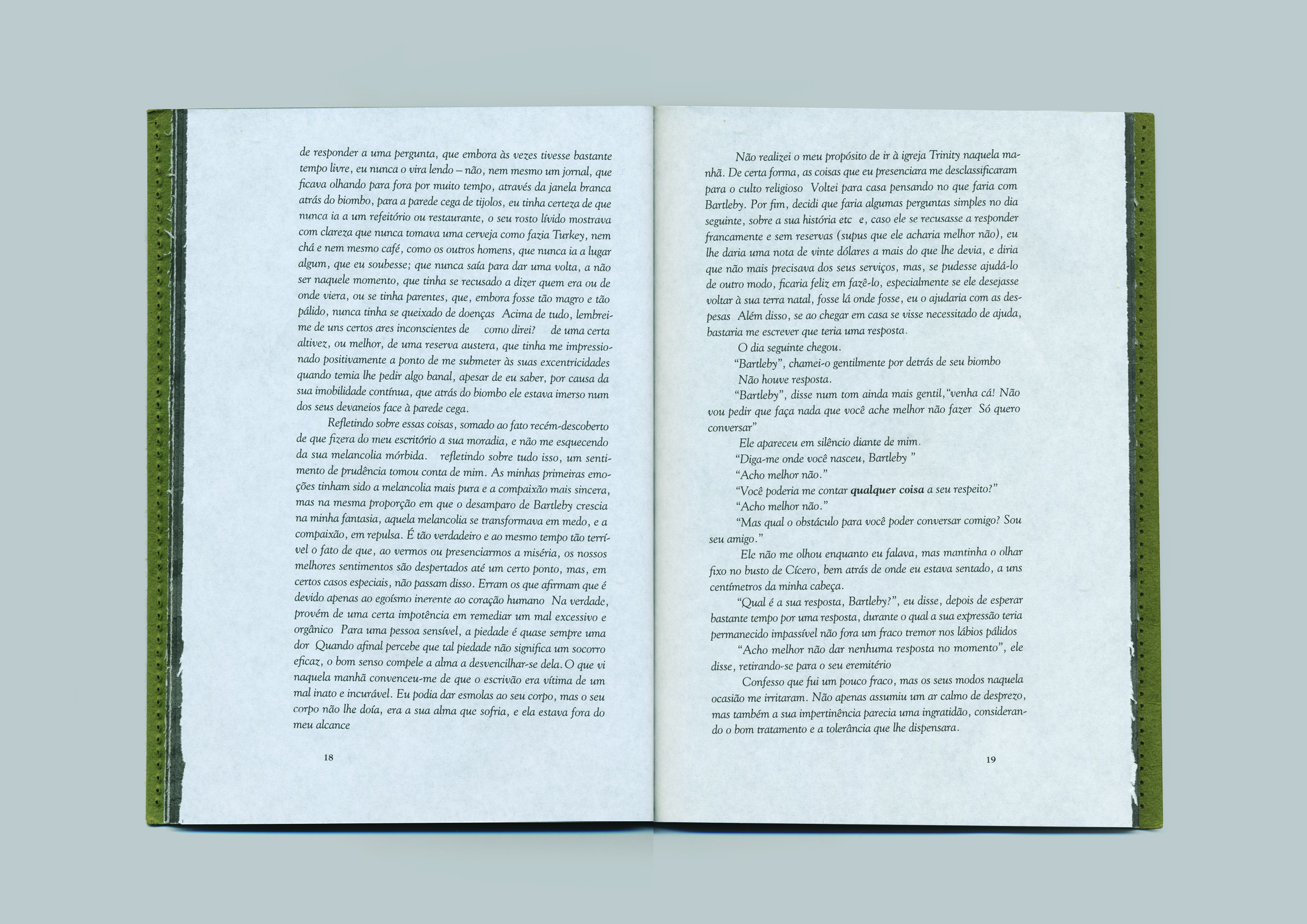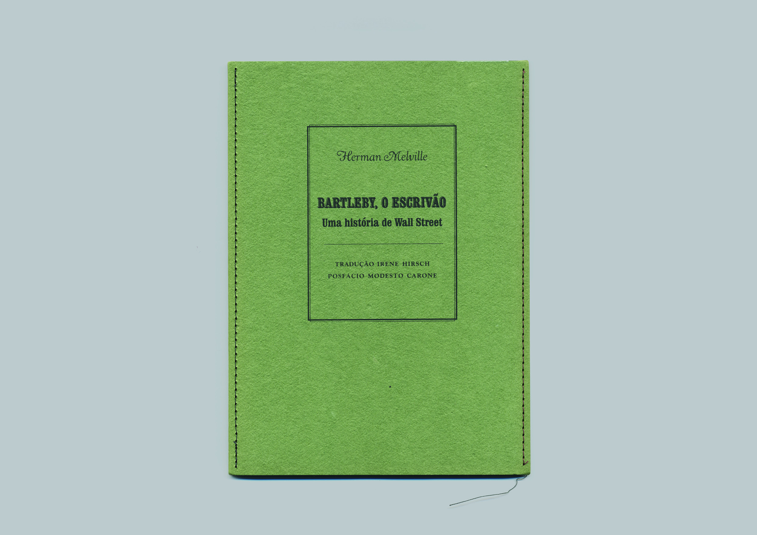 Depois de ler esta passagem, dificilmente se imaginaria uma melhor cor do que o verde para esta capa — sendo a capa aquilo que nos separa de Bartleby, o livro, e nos permite tanto entrar nele, como manter a privacidade. Não só o verde, mas também a sua textura granular, que lembra a de um tecido espesso, e a estrutura forte, que não chega a ser a de uma capa dura, mas que mantém a sua forma inerte, como um biombo, parecem ser as escolhas mais adequadas para este livro, como se elas fossem simplesmente naturais — o que é tantas vezes uma clara indicação de sucesso num projeto gráfico.