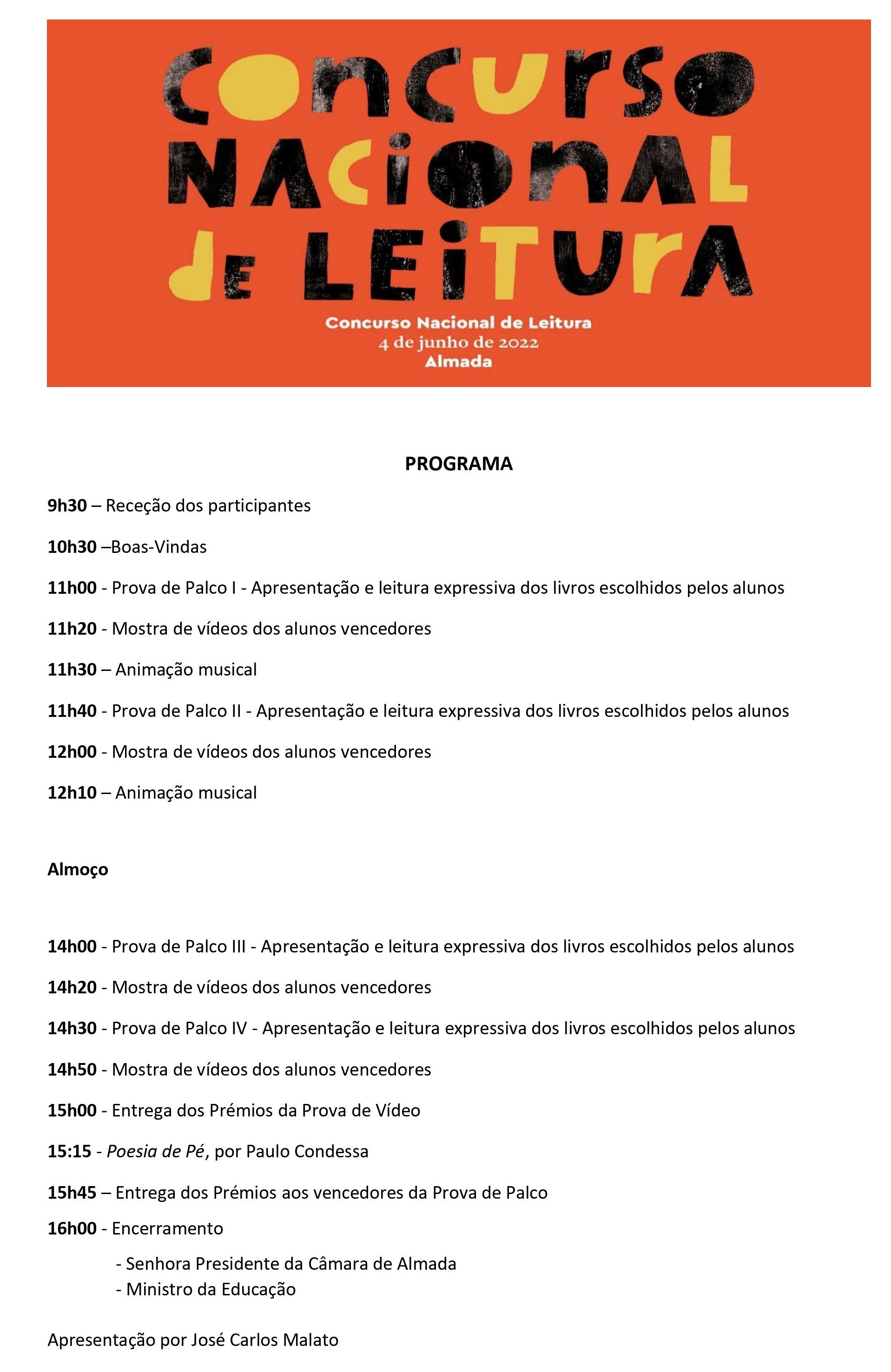 A Fase Nacional da 15.ª edição do Concurso Nacional de Leitura terá lugar entre os dias 10 de maio e 4 de junho de 2022, data da festa final, e será constituída por: