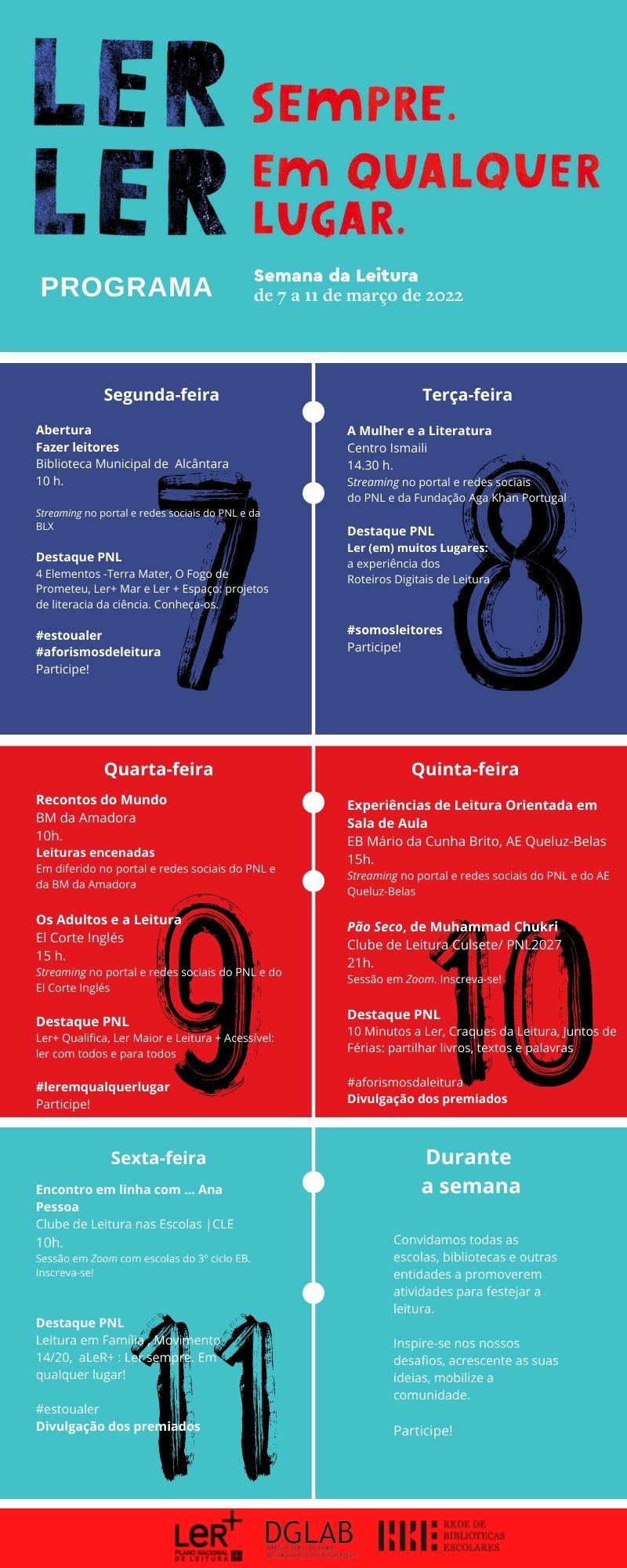 Veja o programa completo, registe no SIPNL a(s) iniciativa(s) que planeia concretizar e partilhe connosco as experiências vividas nesta semana. Vamos criar uma rede de palavras, vozes e textos que revele a leitura e a escrita como expressões de saber e de liberdade.